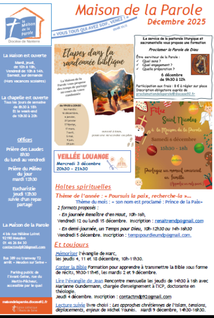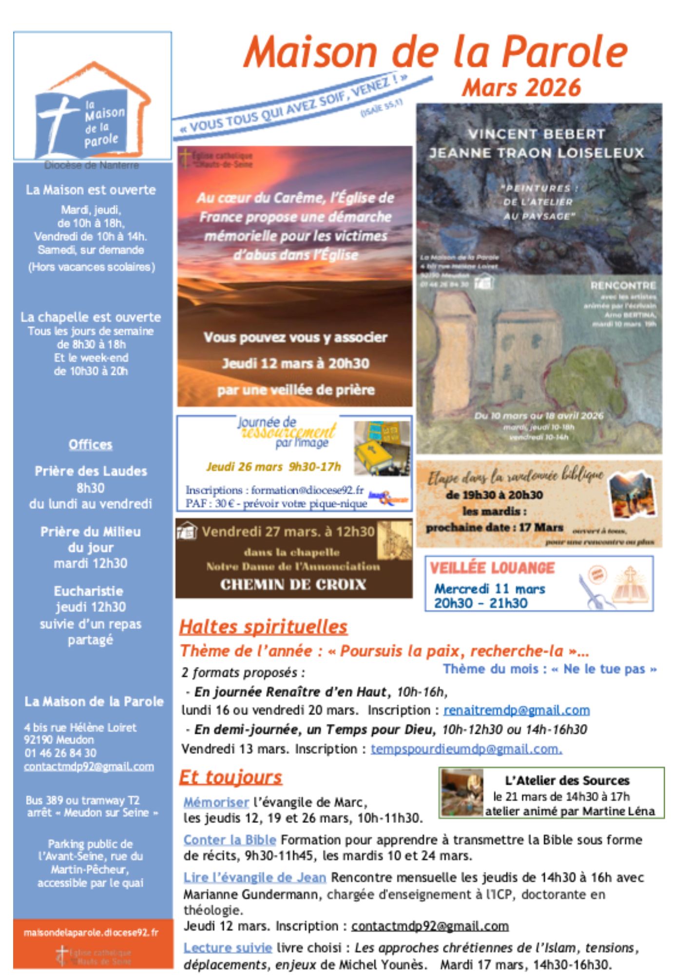 - Offices : Laudes à 8h30 en semaine, Milieu du jour à 12h30 le mardi